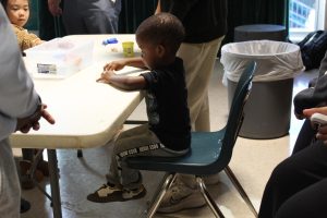 Gabriel tries to construct a boat that can float with play-dough. NSHS students helped the children understand how different shapes can float by visual demonstration.